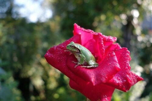 (2017.9.9 7:40am 大きな画像) 午前7時7分、朝露に濡れたバラにカエルを見つけました。ここで夜を明かしたのかな。レンズを近づけすぎたからだね。ピョンと下草の中へ逃げてしまいました。 午前7時38分、朝のゴミ出しを終えて『また居…