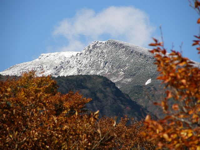 塩沢スキー場からは、紅葉の彼方に白く雪を被った鉄山がよく見えました。