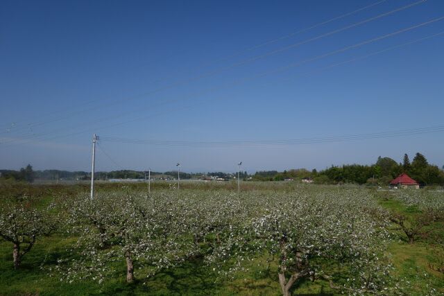 浜尾遊水地を経由して小作田橋の手前、この一帯は広く果樹が栽培されています。リンゴ、ナシ、モモ・・・きょうは消毒作業のスピードスプレヤーが、虹色に輝く霧を吹き上げながら忙しく走り回っていました。