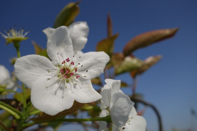 林檎の蕾は紅をさしたようにオシャレで赤いのです。蕾がふくらんでくるとピンク。咲き始めはピンクと白のまだら、そして白い花になっていくようです。