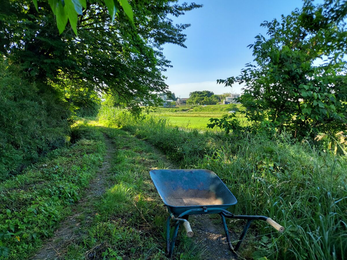 収集所へ運んだ後は、一輪車を押したまま朝の農道散歩へ移行します。
