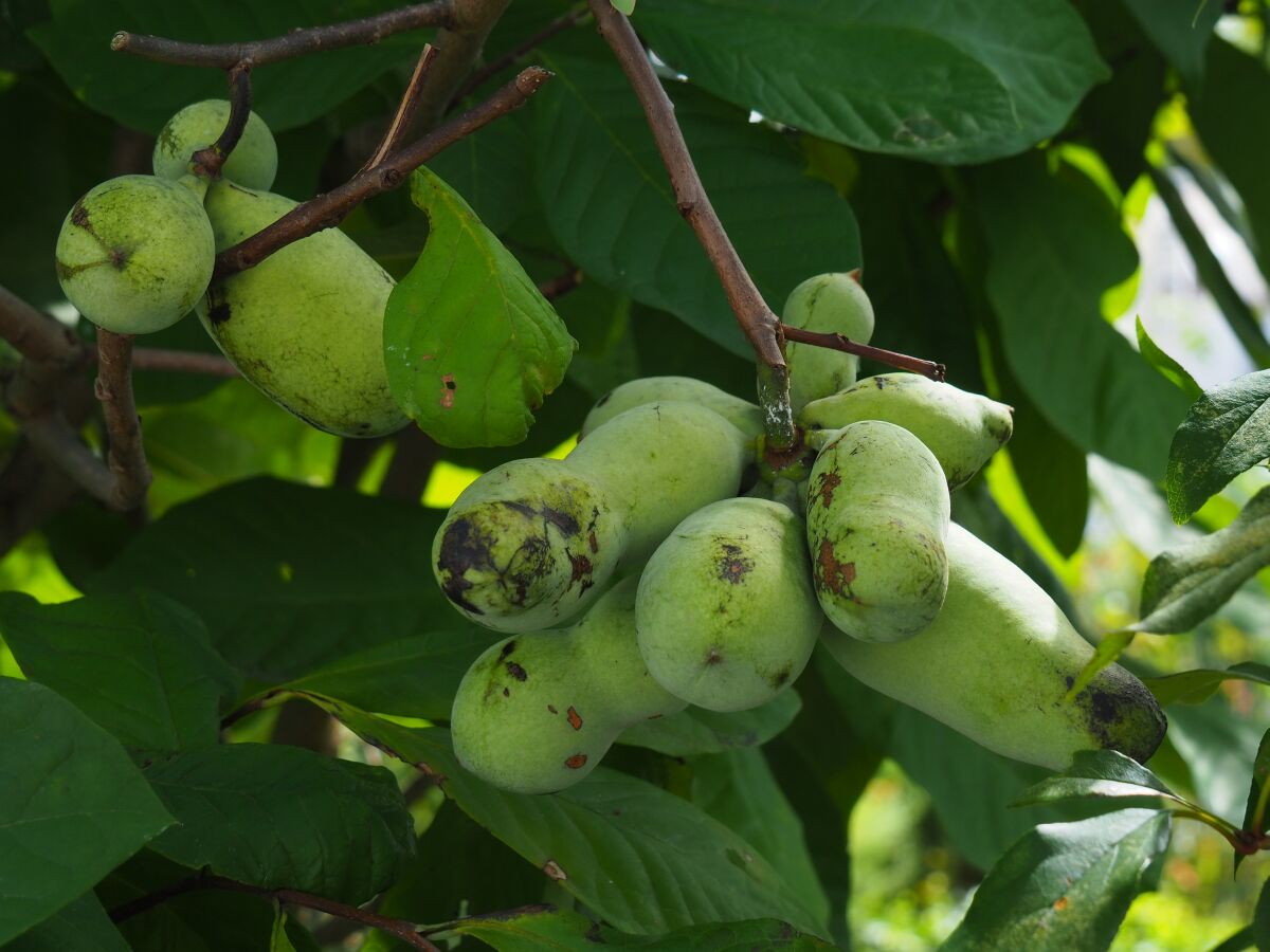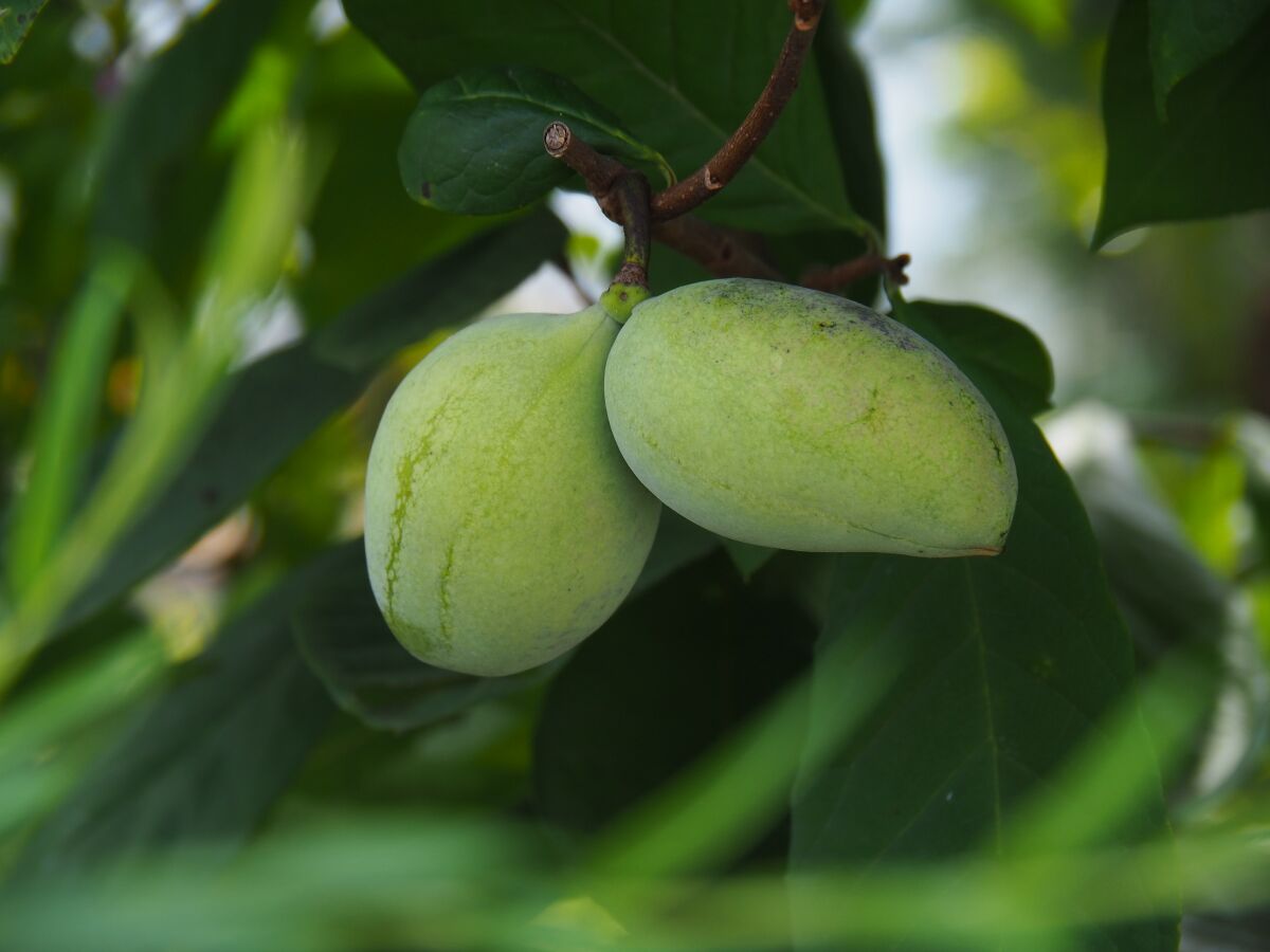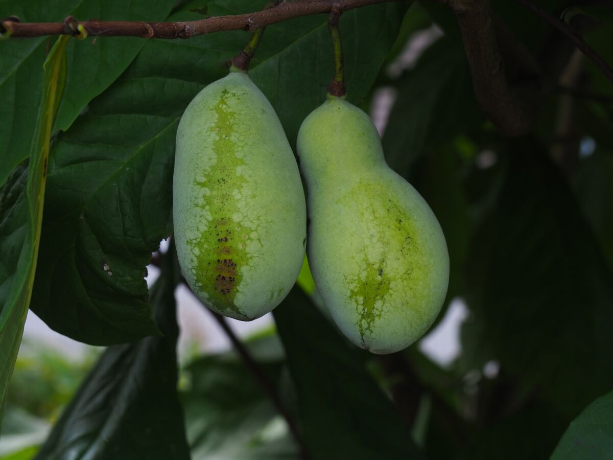 今年も昨年に引き続き、面倒なので人工授粉はしませんでした。しかも、その後に摘果もせずに放りっぱなしだったので、この房には8個も成っているんです。本来ポポーとはこのような成り方なのかも知れませんが、これほど沢山成ってしまうと一つ一つが小さすぎて食べられるのかどうかも分かりません。