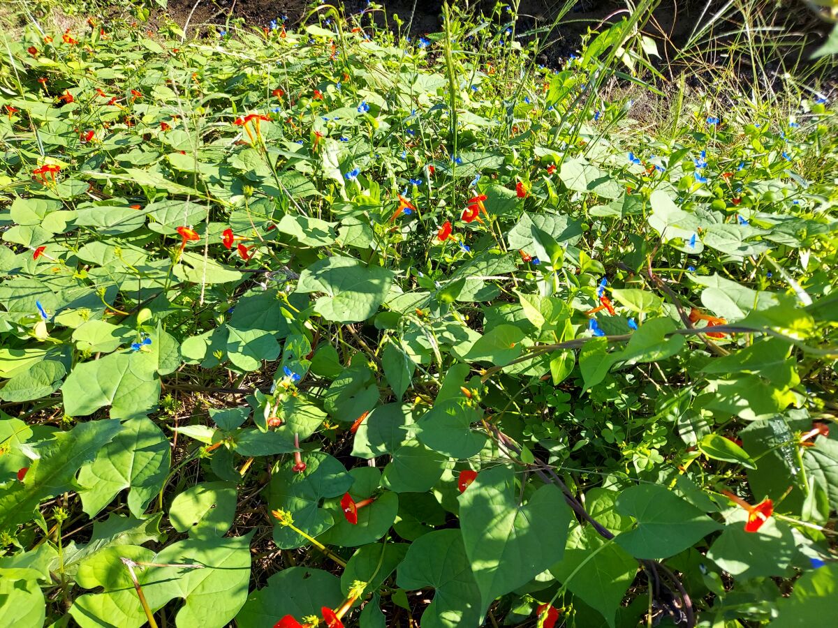 農道路肩の鮮やかなオレンジとブルーはマルバルコウソウとツユクサ。