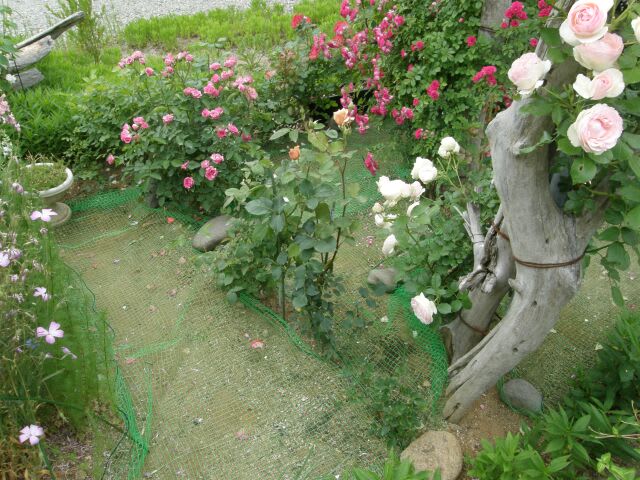 そこで、これをもう一カ所の薔薇の花壇にも応用することにしました。「おてがる菜園ガードフェンス(1m×50m)」はホームセンターで似たようなものが¥1,800~¥2,500ぐらいで販売されています。わたしが買ったものは¥1,886でした。50mもあるのですから、惜しげなく使用できます。