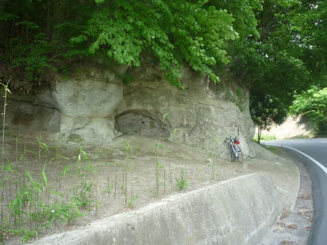 県道55号線を進んでいると、先日の「神成横穴墓群(かんなりおうけつぼぐん)」の場所に着きました。墓群はこの道路で分断されましたが、こんな風に道路から見ることが出来るんです。まあ、ちょうどカーブだから自動車で止まるのは危険。通り過ぎざまにチラッと見るしかないですけどね。自転車だとこうしてじっくり見れちゃうところがイイですね。