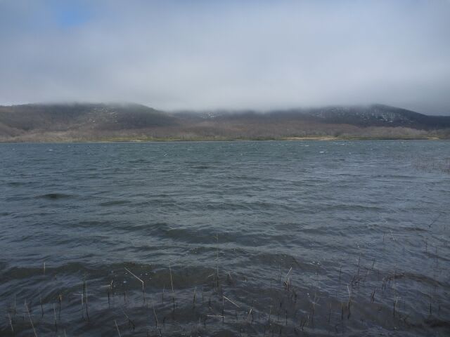 結構風が吹いていて湖面に波が立っています。今年は桜の開花も遅かったのですから、おそらくミズバショウもだいぶ遅れているのかもしれません。