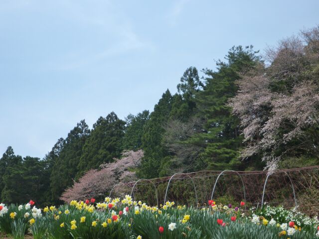 満開の水仙と咲きかけの山桜。