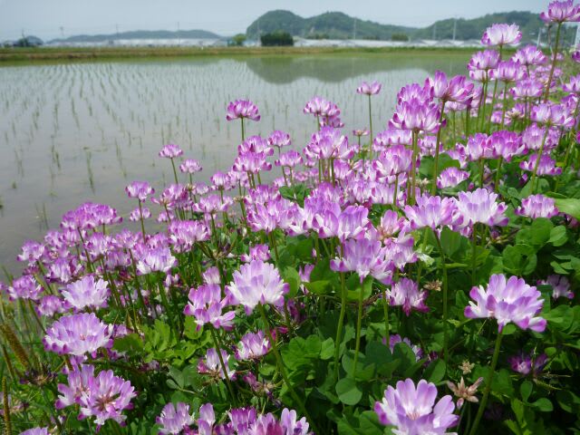 田植えの済んだ田んぼの土手に、ひときわ鮮やかなレンゲの花。レンゲってこんなに綺麗なものだったのですね。