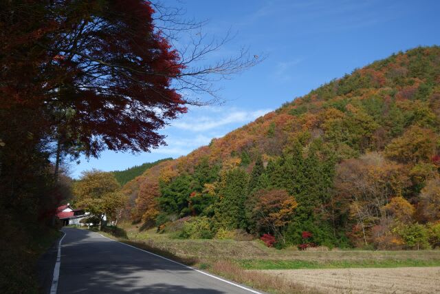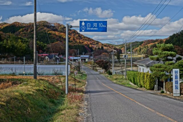 白河の関を後にして、県道76号線と県道280号線のY字路に、二十三夜塔とお地蔵様のような石仏がありました。モミジを背景にしたその様子が、なんとも“水木しげる”風で思わず停まって写真を撮りました。