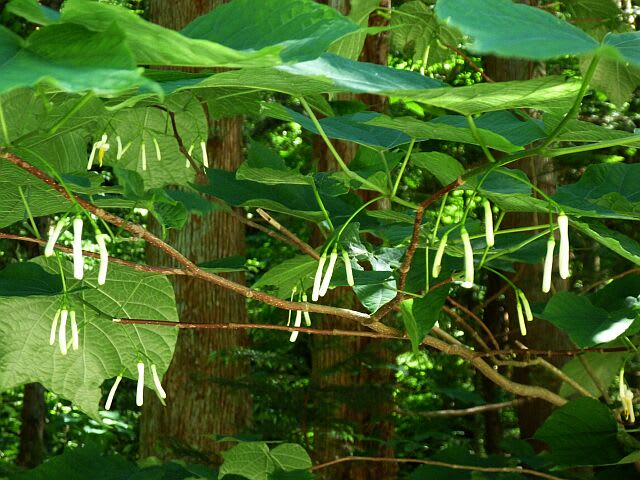 途中で出くわした植物。下がっているのは細長い形をした蕾のようです。(後日、この花は“ウリノキ”だということが“mimozaさん”のブログから判明いたしました)