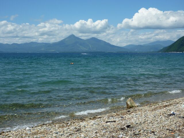 湖畔に出て自転車を降り、足下の草をかき分けながら湖に向かいました。