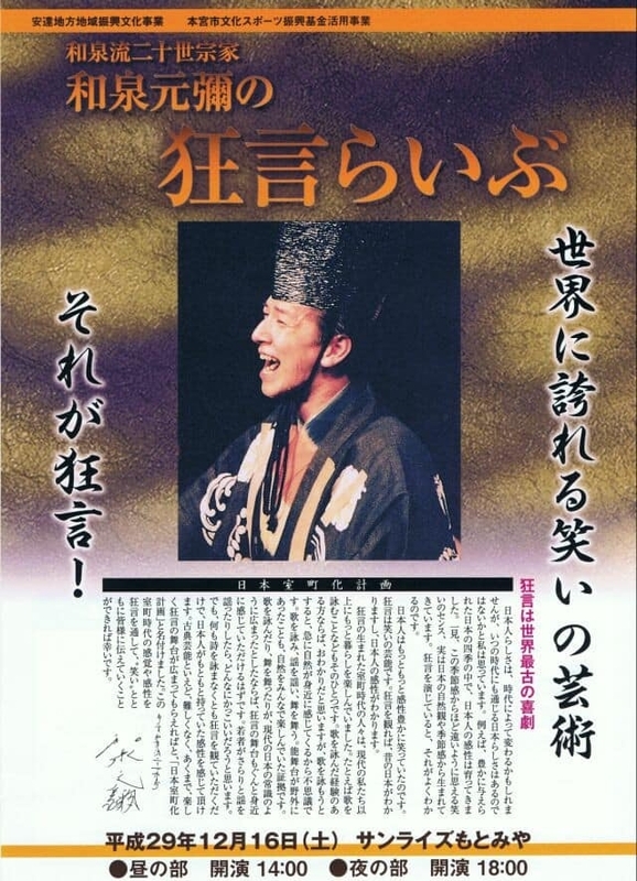 12月16日、当市の文化施設“サンライズもとみや”において『和泉元彌の狂言らいぶ』公演がありました。“ワイフ君”とわたしの席は演者のこめかみに光る汗もみえるほどの“かぶりつき”。