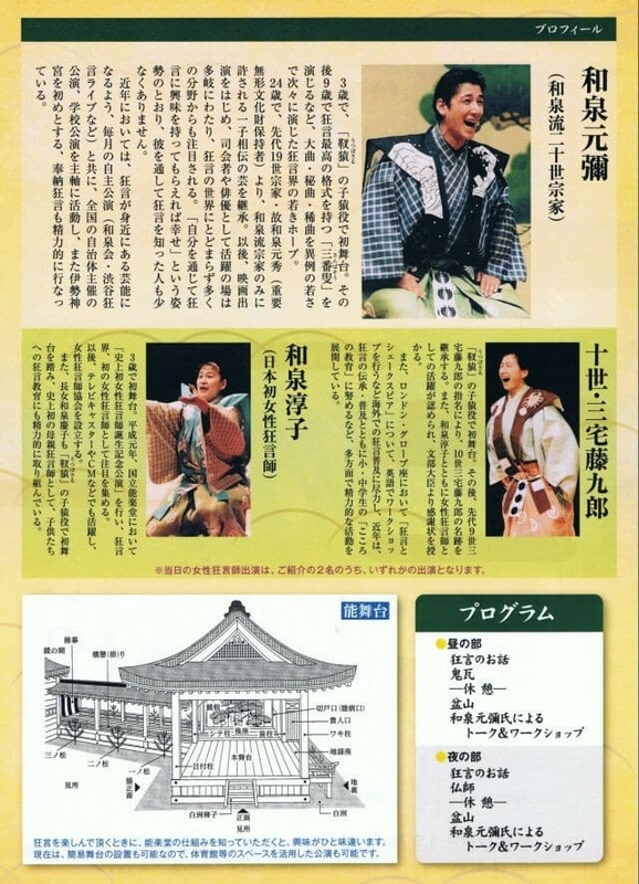 きょうの演目は、“盆山(ぼんさん)”(和泉元彌と和泉淳子)と“鬼瓦”(和泉元彌と十世・三宅藤九郎)。はじめに和泉元彌氏ご本人より狂言についてのレクチャーがありました。狂言の歴史から能舞台の仕組み、演技や所作の意味、演目のあらすじなどについて予備知識をいただいたことで、初めてにもかかわらず一歩踏み込んだ狂言の面白さを鑑賞出来たような気がいたしました。