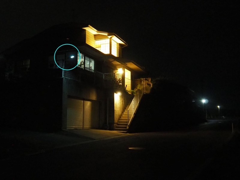 以前、“変なおじさん”がわが家の前に出没したこともあり、勤めて家の周りは明るくしておくように心がけているんです。<青〇>はソーラー外灯、<赤〇>は人感センサーライト、<緑〇>はタイマーで点灯する灯りです。