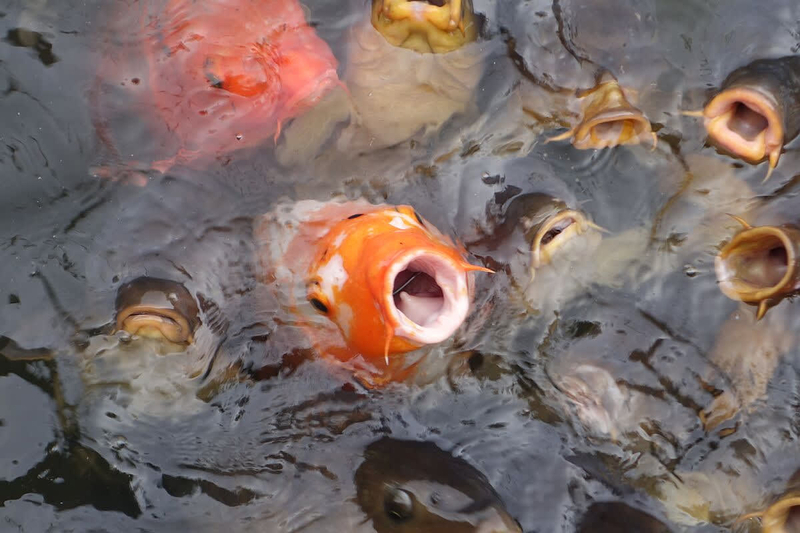 “ワイフ君”がコイのえさを買ってきたのでみんなであげました。大きな口がポコポコあくのが面白いやら気味が悪いやら・・・。