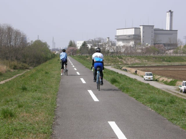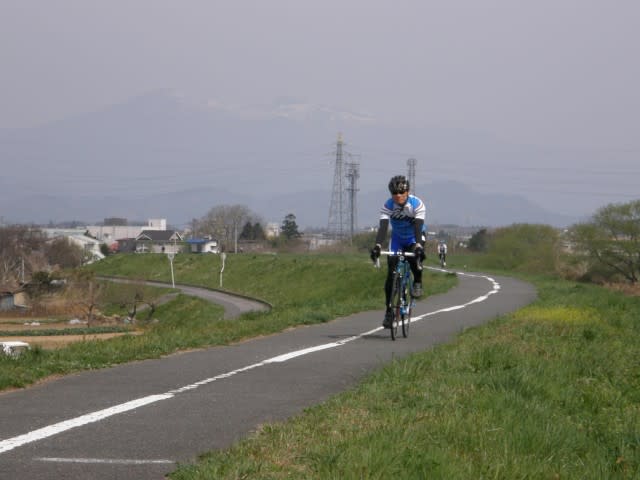 春らしい最高の天気で、とても気持ち良く走れます。と、“dietshuさん”のうしろから、春風のごとく爽やかな走りで迫ってくる一人のローディーさん。写真を撮っていたわたしたちを、とても綺麗なペダリングでパスして行きました。