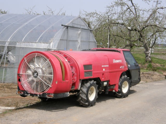 みちのく自転車道を須賀川市に進んでいくと、ジェットエンジンを付けたスーパーカーが駐車してありました。ハハハ、果樹の消毒専用車でした。