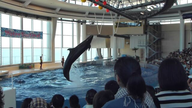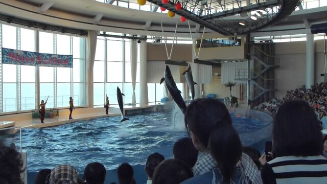 12時のイルカショーは満席で入場出来ず、次のショーになってしまいました。午後2時のショーには30分前にかけつけましたが、それでもイス席は満員で立ち見スペースになってしまったのでした。