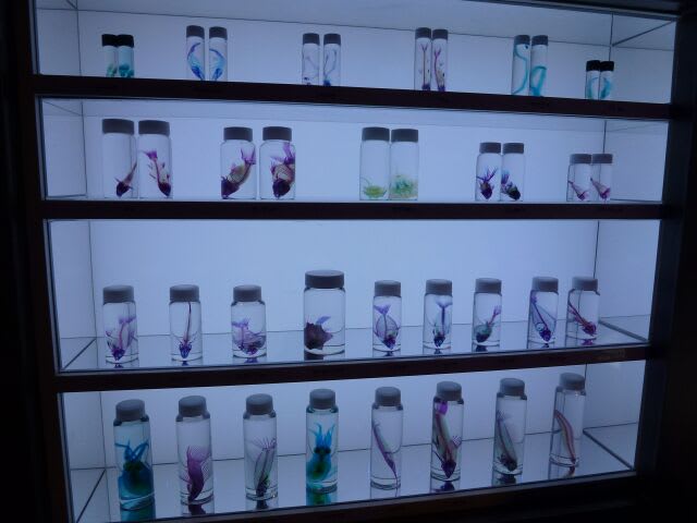 これらは全て“透明標本(透明骨格標本)”と呼ばれる特殊な処理を施した標本です。こうしてみると綺麗なものですね。